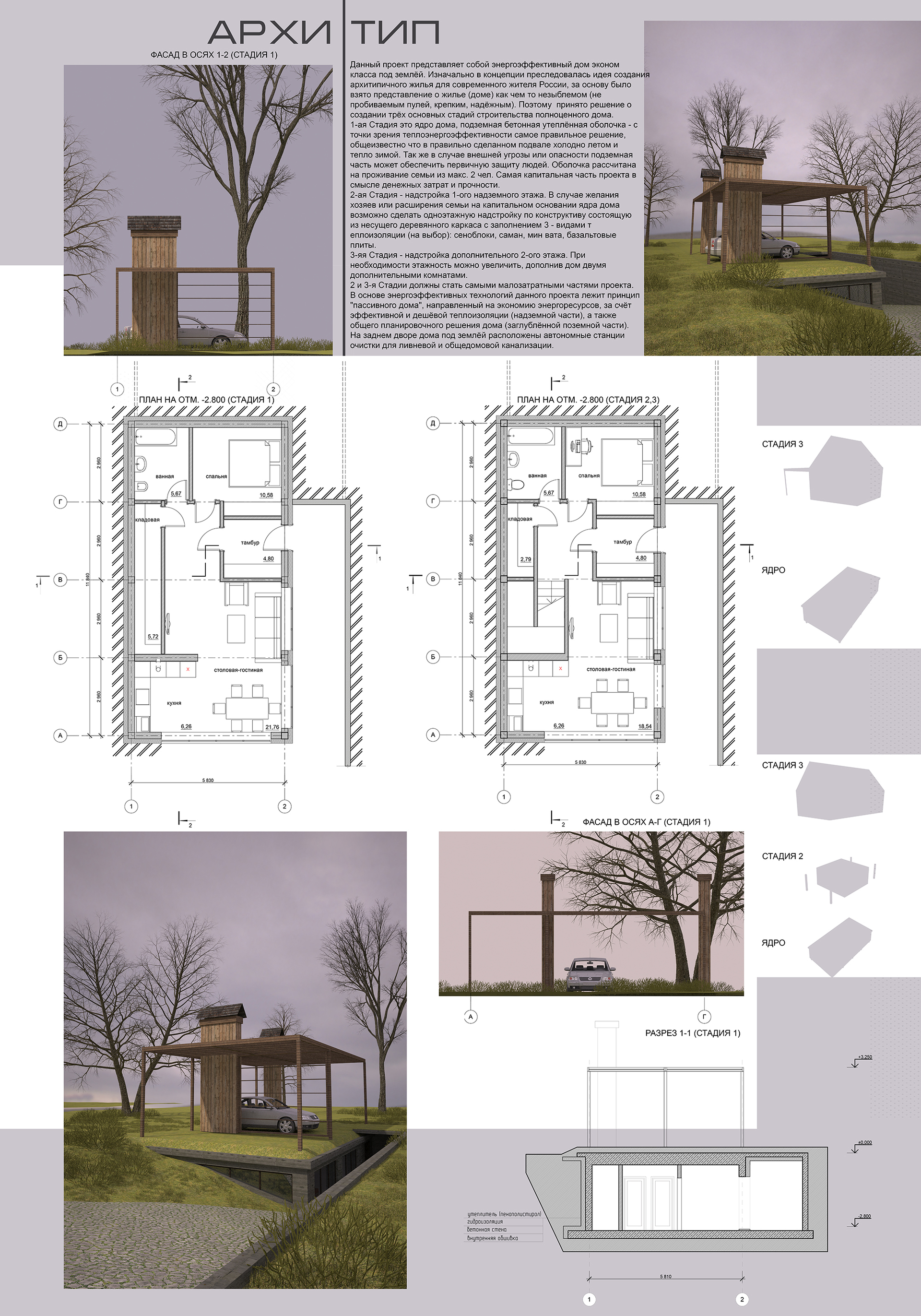 2 и 3-я Стадии должны стать самыми малозатратными частями проекта. В основе энергоэффективных технологий данного проекта лежит принцип "пассивного дома", направленный на экономию энергоресурсов, за счёт эффективной и дешёвой теплоизоляции (надземной части), а также общего планировочного решения дома (заглублённой поземной части).