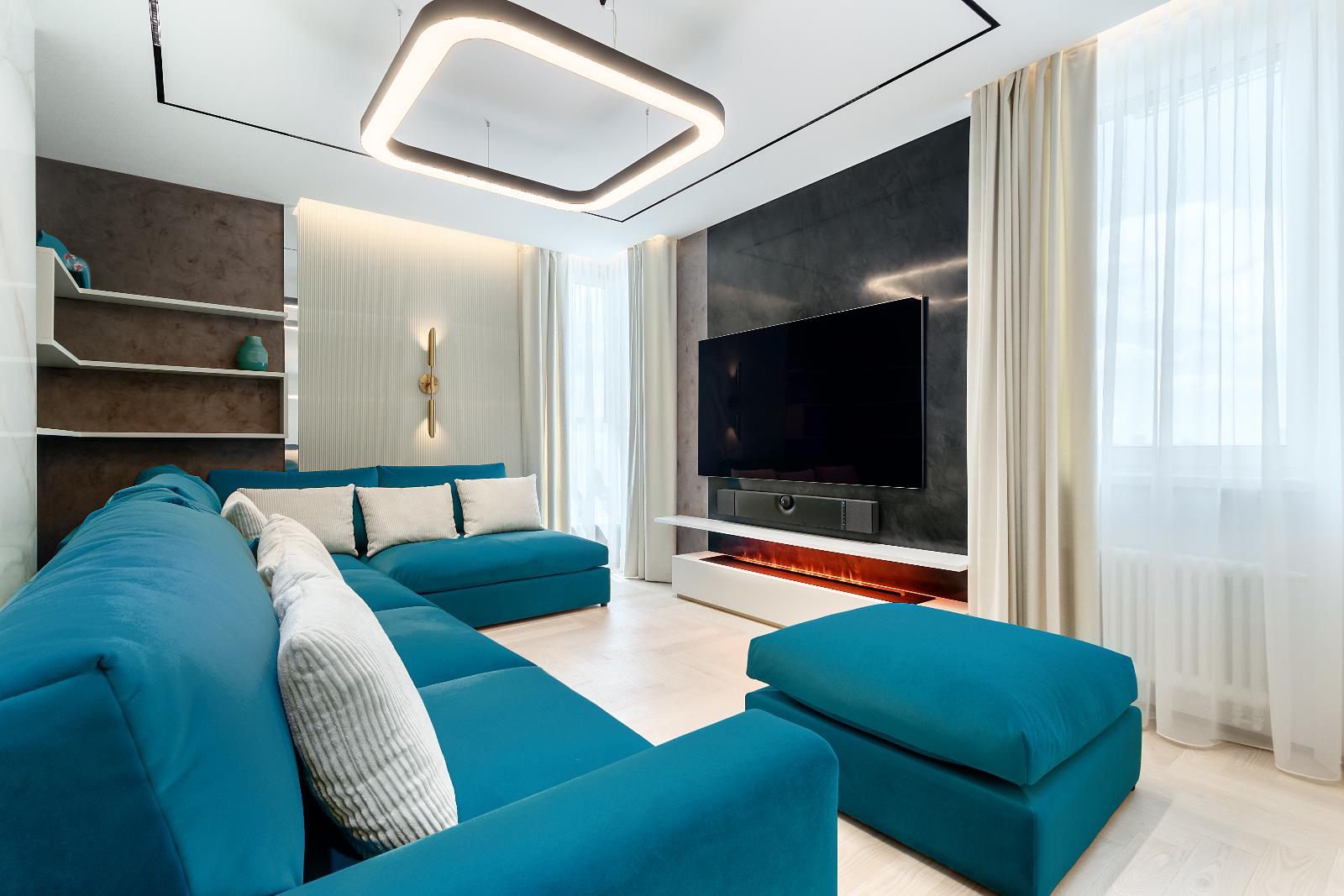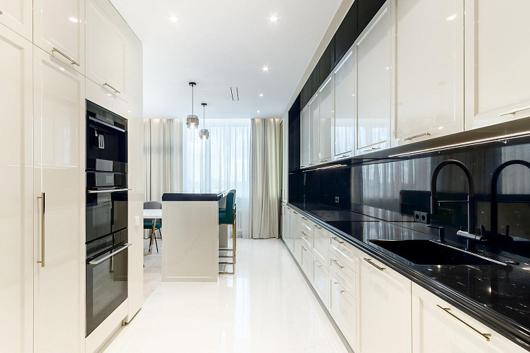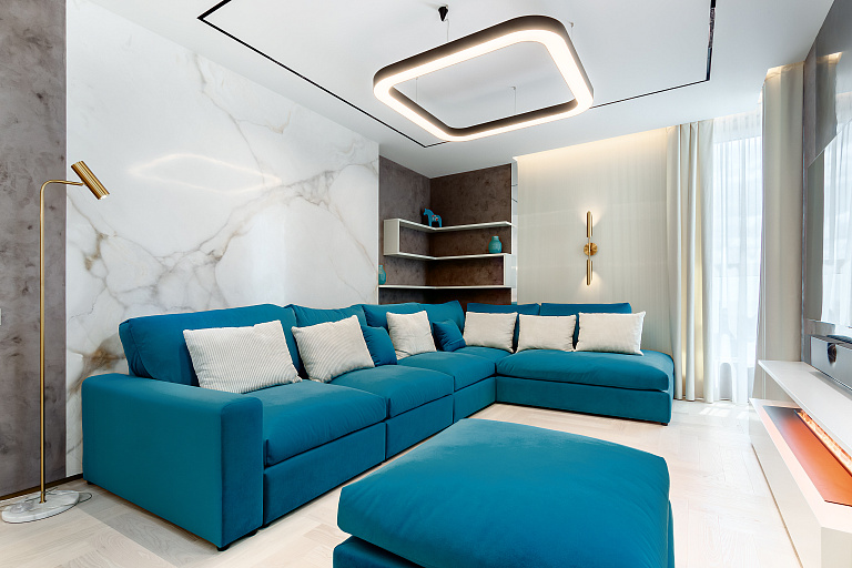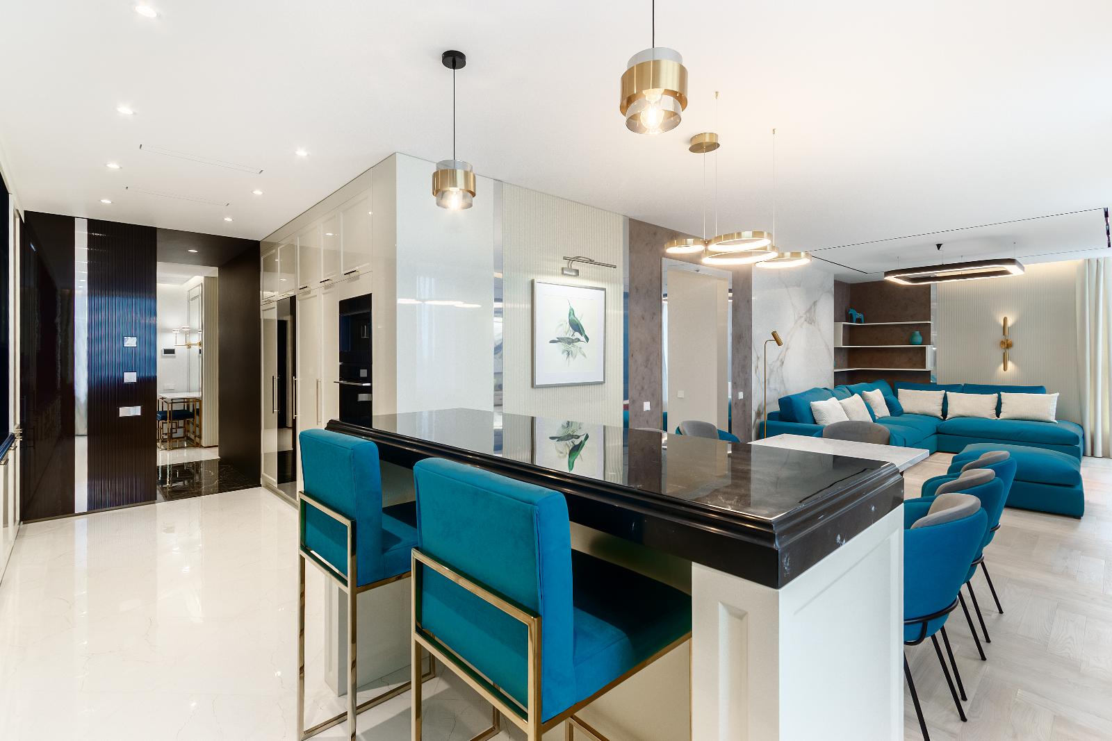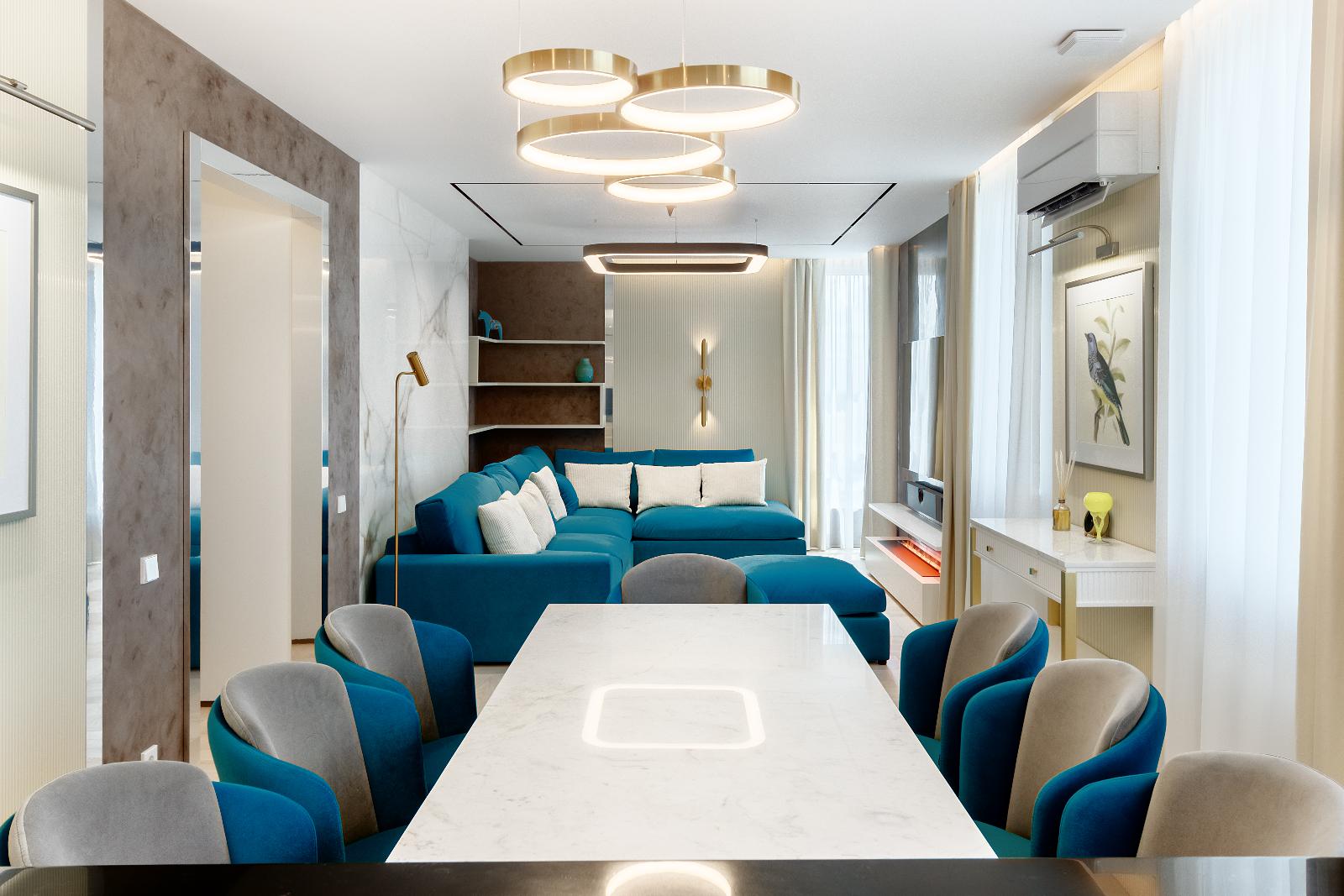 Квартира располагается в Ростове-на-Дону в жилом комплексе Островский . Ставилась задача сделать интерьер для семьи из 4-ех человек, объединив при этом в единое пространство 2-е квартиры. Заказчиком ставилась задача спроектировать большое пространство объединённой кухни-гостиной, главную спальню с собственным гардеробом и санузлом и две детские комнаты.