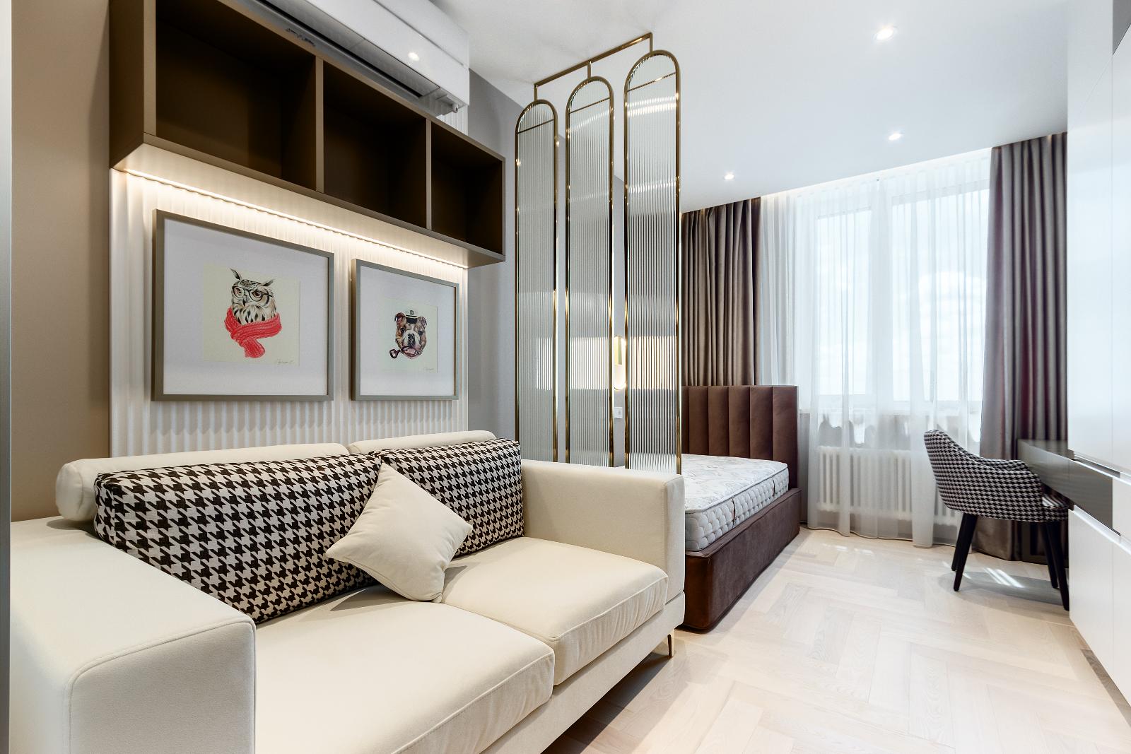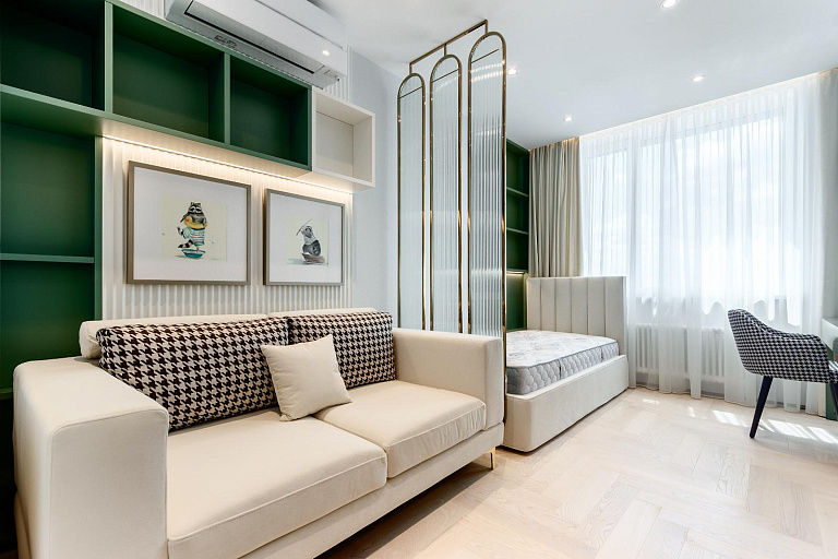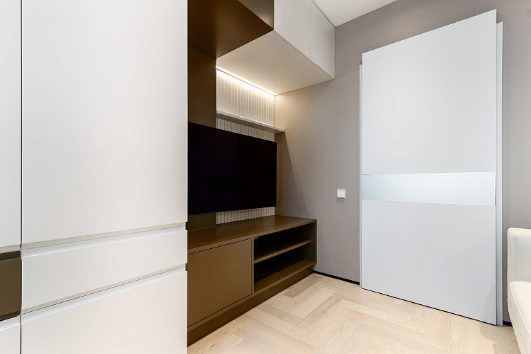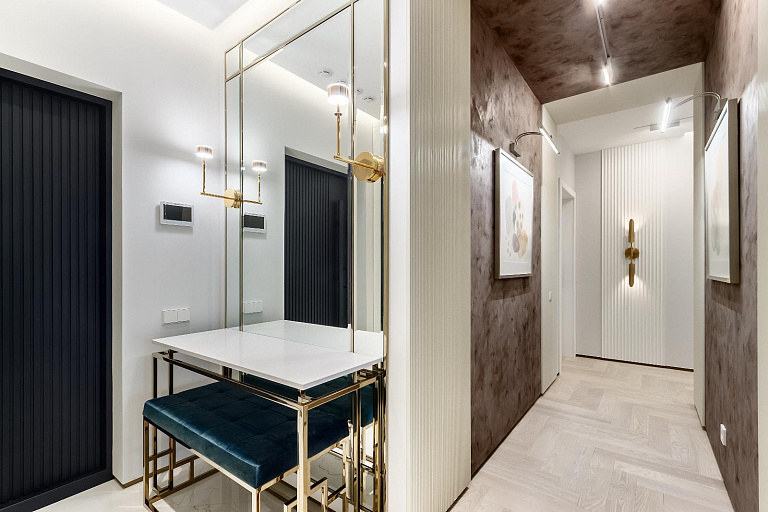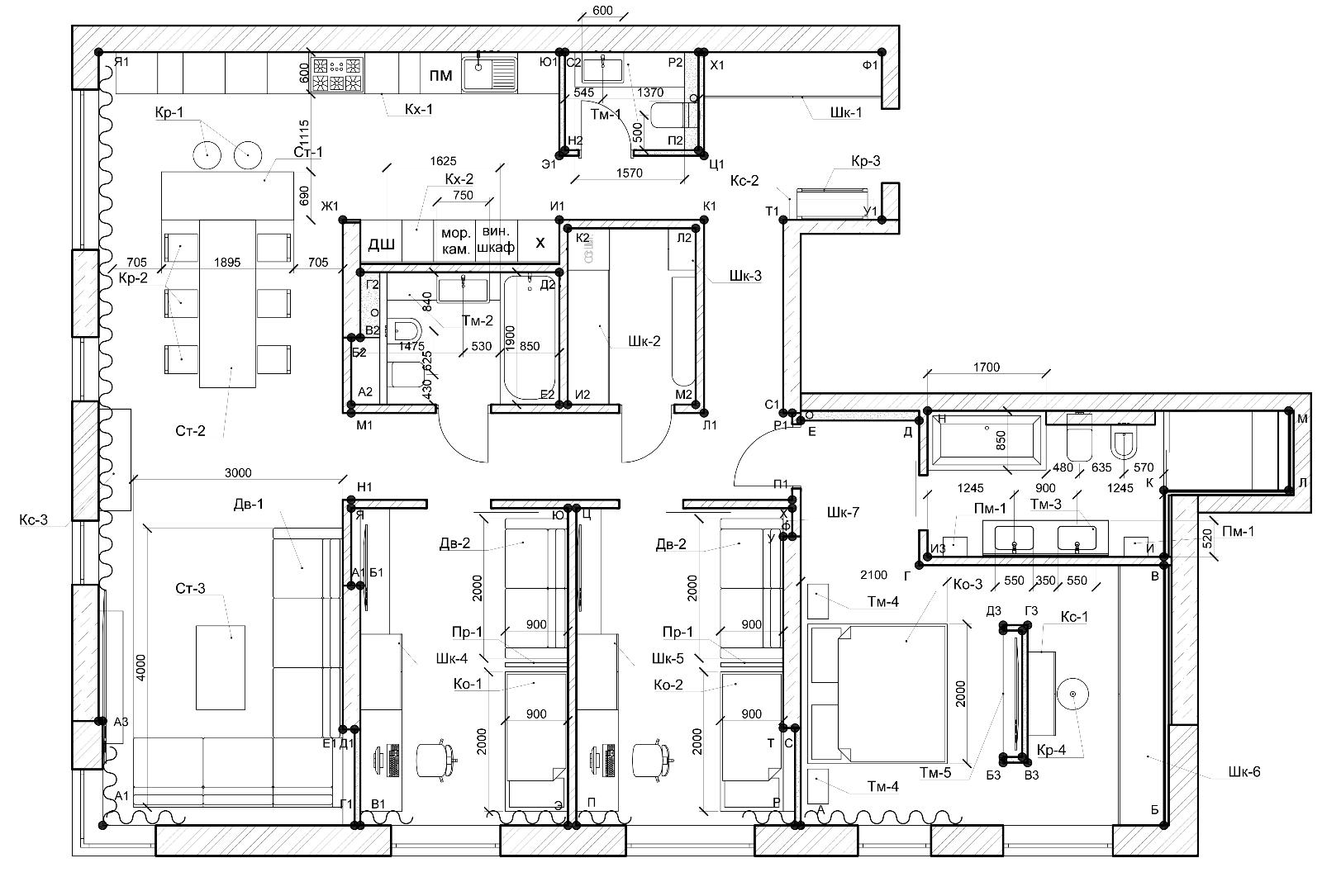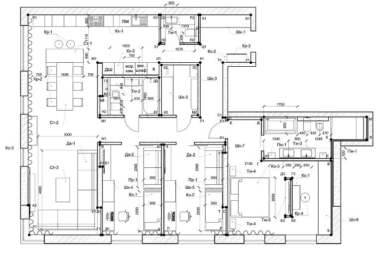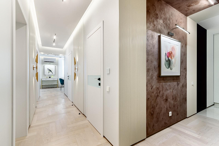 Квартира располагается в Ростове-на-Дону в жилом комплексе Островский . Ставилась задача сделать интерьер для семьи из 4-ех человек, объединив при этом в единое пространство 2-е квартиры. Заказчиком ставилась задача спроектировать большое пространство объединённой кухни-гостиной, главную спальню с собственным гардеробом и санузлом и две детские комнаты.