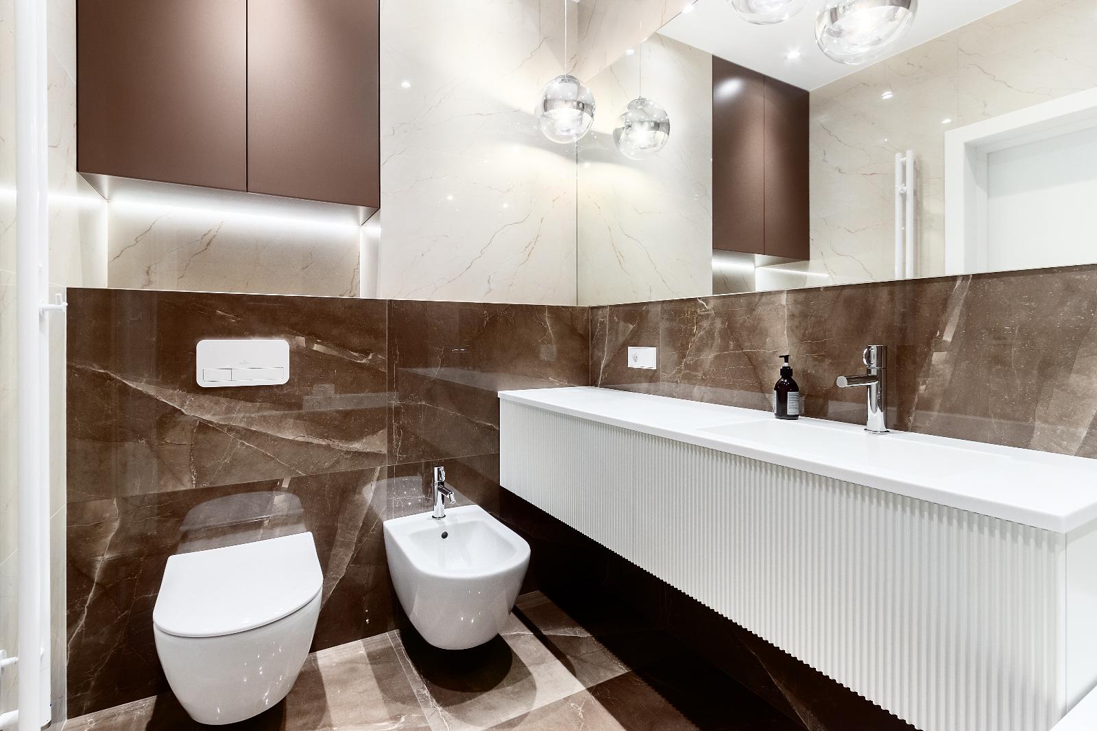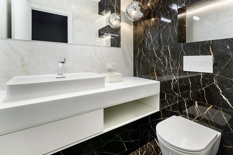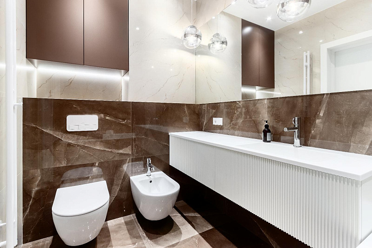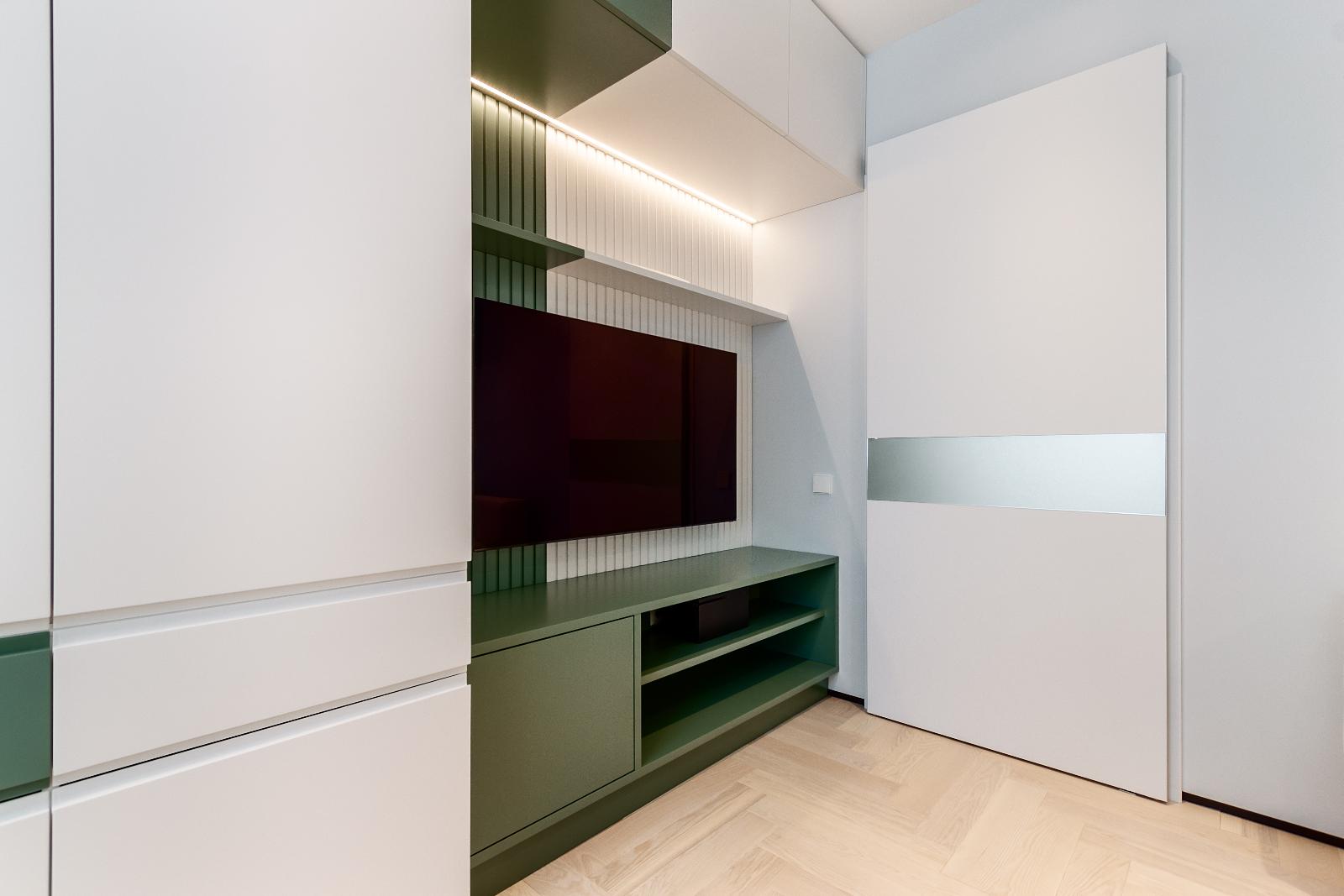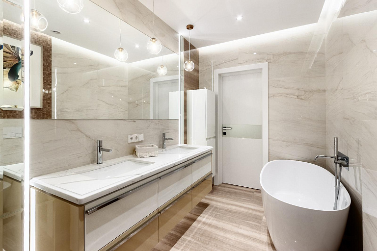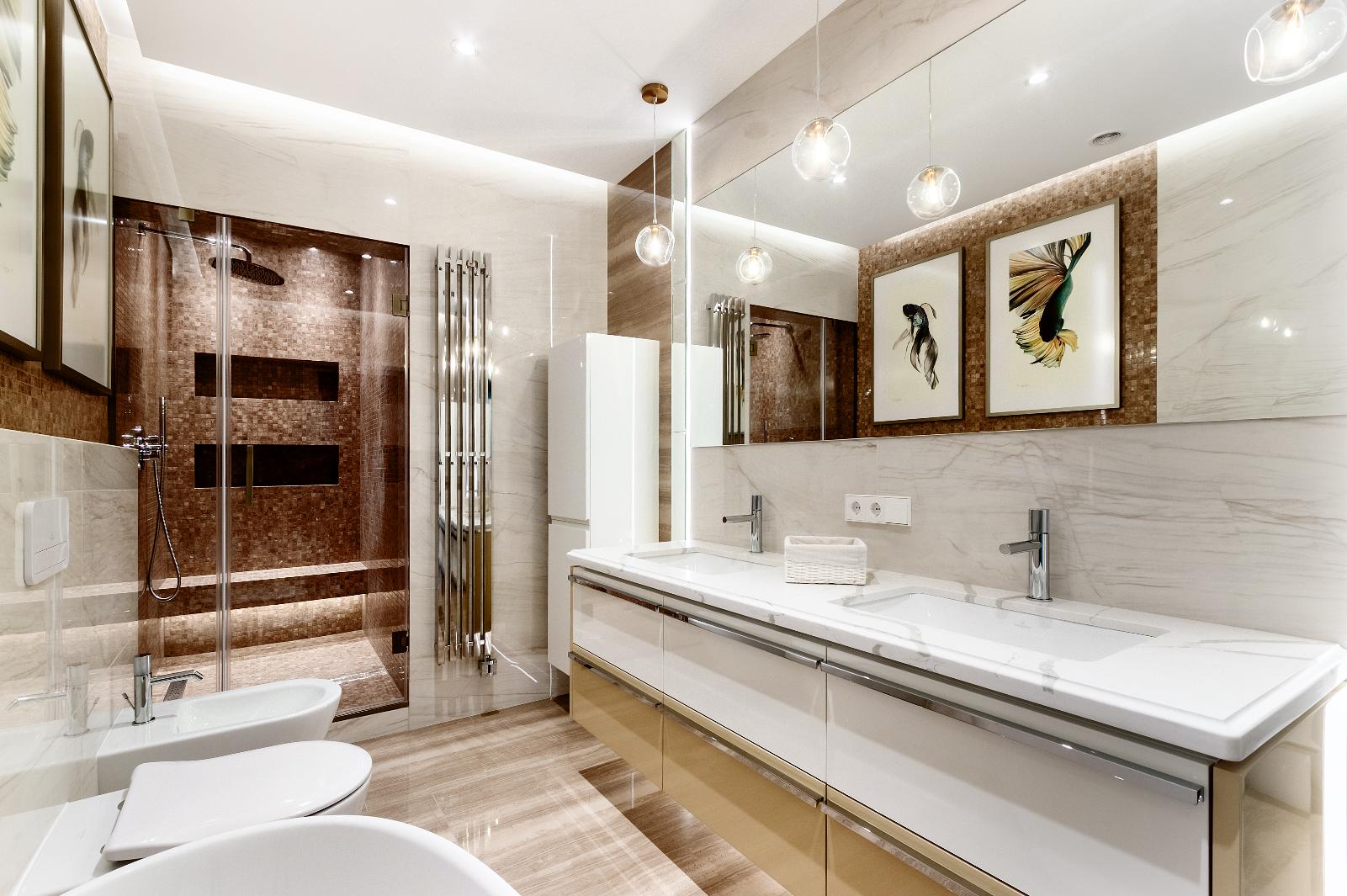 Квартира располагается в Ростове-на-Дону в жилом комплексе Островский . Ставилась задача сделать интерьер для семьи из 4-ех человек, объединив при этом в единое пространство 2-е квартиры. Заказчиком ставилась задача спроектировать большое пространство объединённой кухни-гостиной, главную спальню с собственным гардеробом и санузлом и две детские комнаты.
