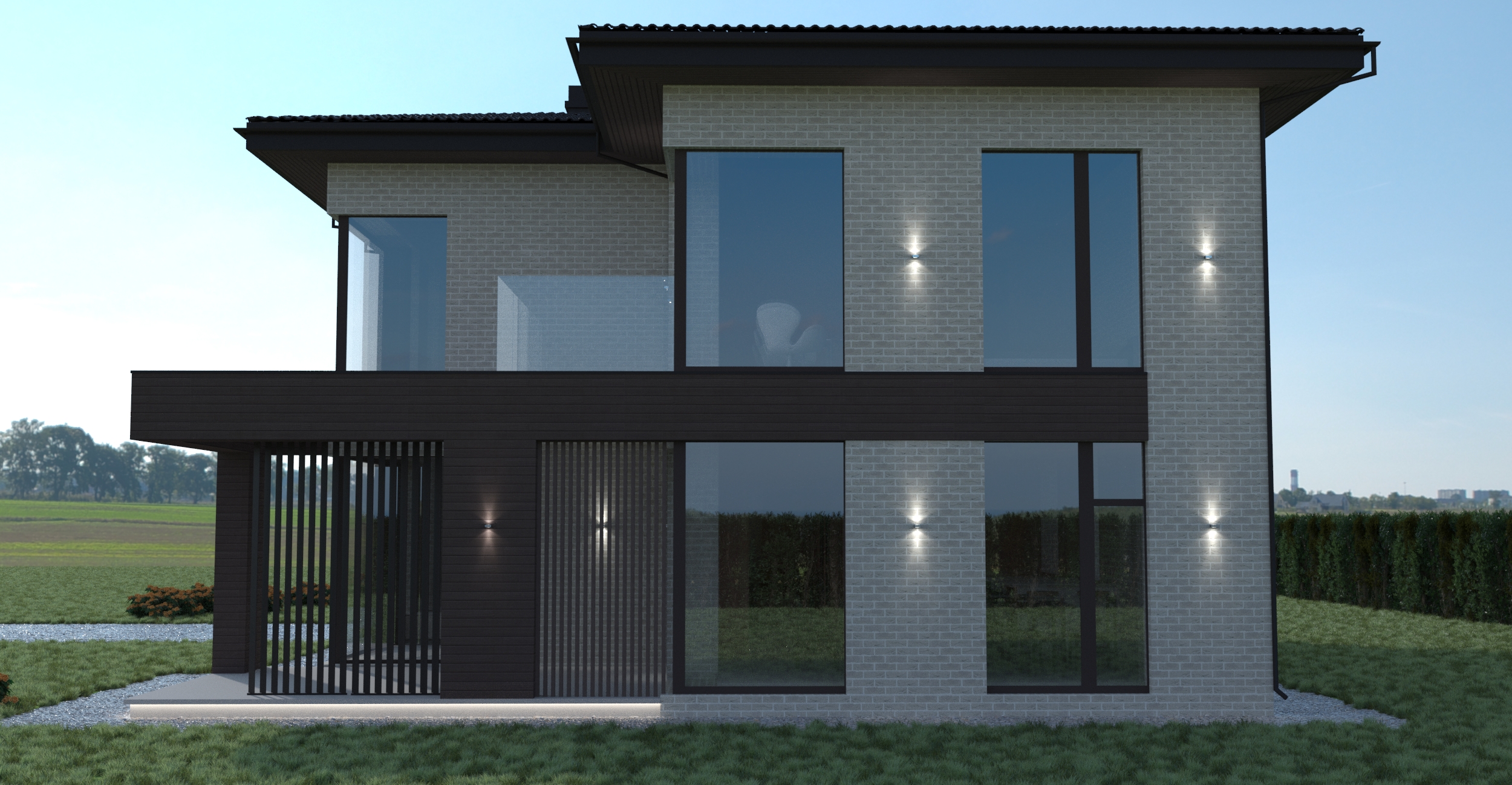Ввиду ограниченности земельного участка (6-ть соток) и обширности планировочных пожеланий было принято решение спроектировать двухэтажный дом. Для визуального облегчения объемов строения в стены интегрированы большие площади остекления и добавлены сложные по конструкции угловые окна, выходящие на террасу и двор.