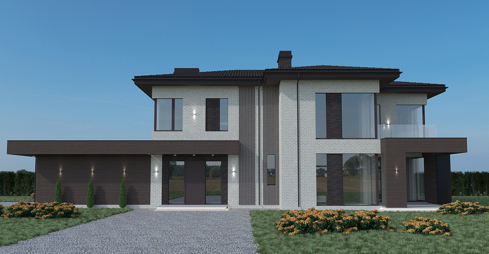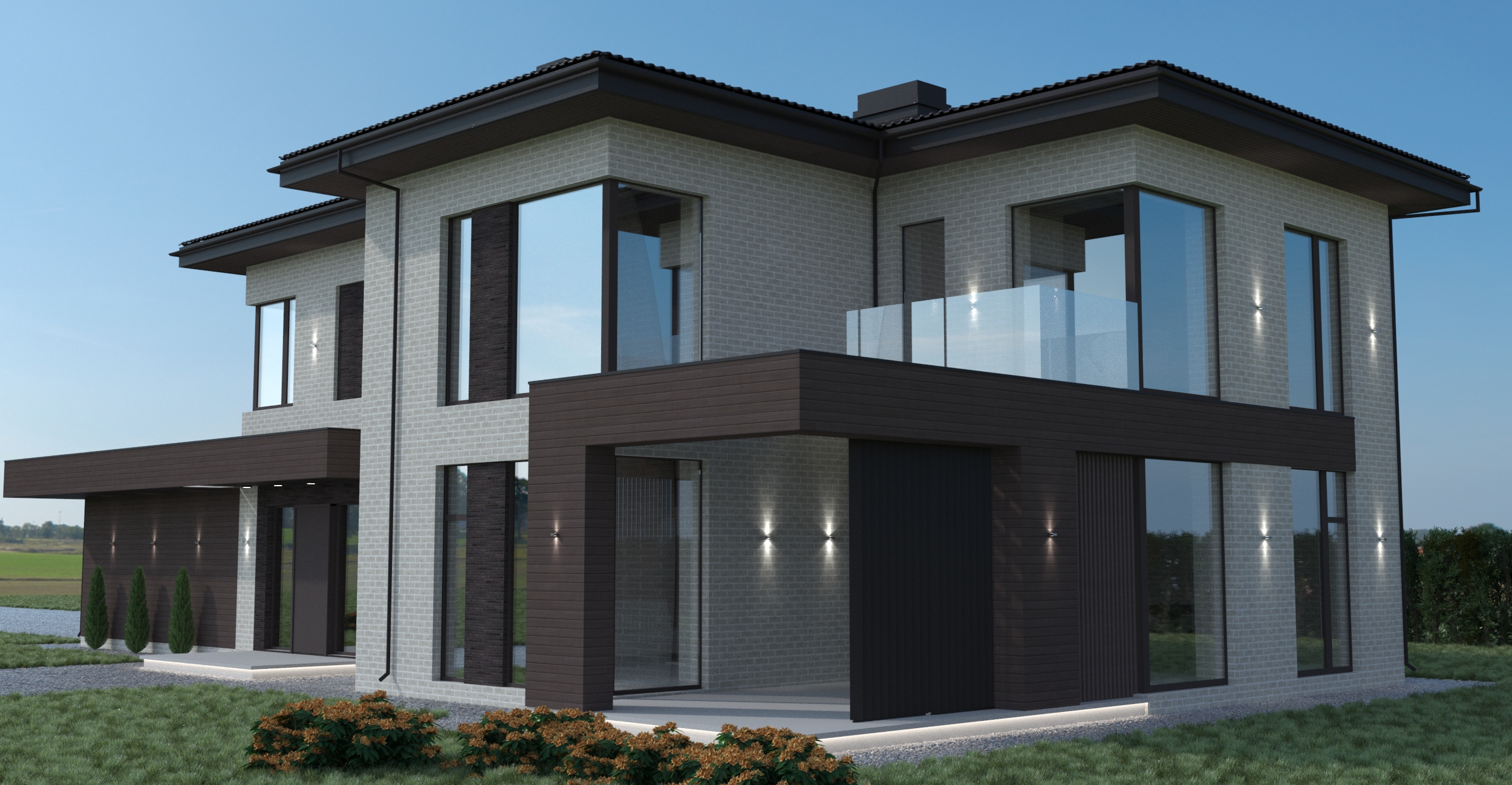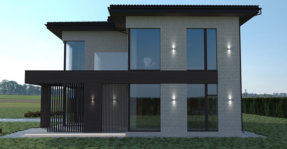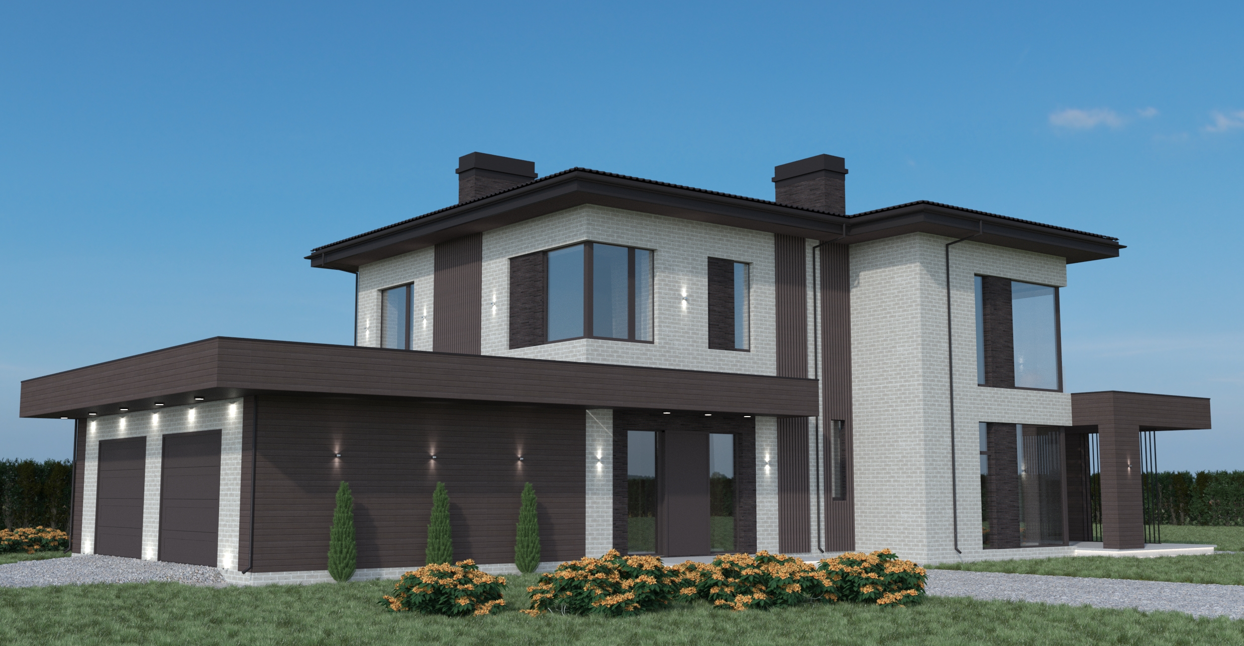 В фасадной композиции было использовано сочетание дерева, фасадных панелей, деревянных реек и кирпича (клинкерного или ригельного).